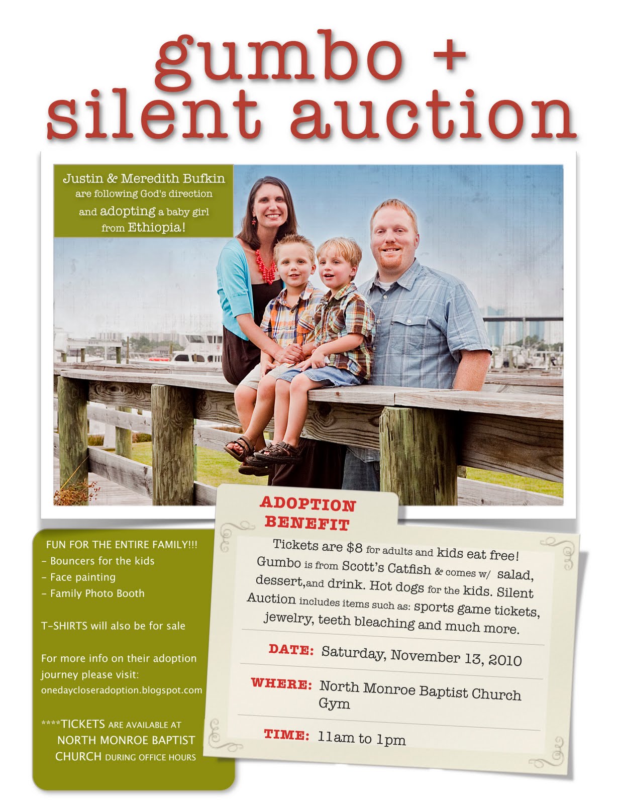 We are so excited about this weekend! Our friends have been working hard and we are beyond thankful. All of the food has been donated, so we will get all of the proceeds from the ticket sales. There are over 50 items for the silent auction. I have just been blown away by the generosity of people, many we have never even met. It just confirms to me that God is in control and that he wants to help bring our little girl home. It truly was a big step of faith for us to say yes to adoption, not really knowing how we were going to pay for everything. So far God has been more faithful than we could have imagined. We would still like to sale 50 more tickets, so if you want one, please let me know. If you can't make it, please pray for God to receive all the glory for whatever happens this weekend.